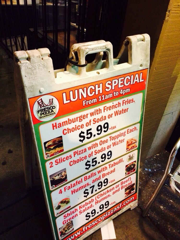 Introducing Fresco Pizza Shawarma, a Middle Eastern - Pizza fusion restaurant located at 1338 Polk St San Francisco, CA 94109. This casual spot offers a variety of options, including pizza by the slice with flavors like Cheese, Pepperoni, Pesto, and their signature Fresco Pizza. The Make Your Own Pizza section allows for customization, while Fresco's Specialty Pizzas like Fresco's Pizza and Go Green Pizza showcase unique flavors. Reviews praise their delicious food, with highlights like the gluten-free pizza and chicken shawarma. Customers appreciate the fresh ingredients, friendly service, and generous portions. With options for vegetarians, late-night cravings, and group dining, Fresco Pizza Shawarma provides a diverse menu in a relaxed atmosphere. Host your next gathering here or enjoy a casual meal with a unique twist.